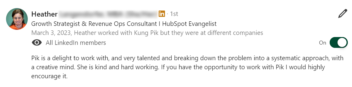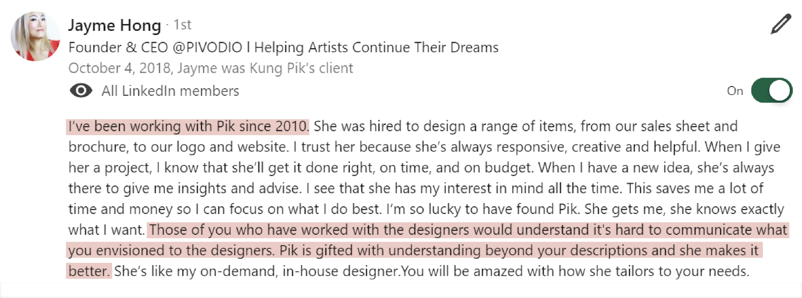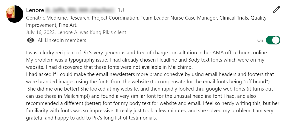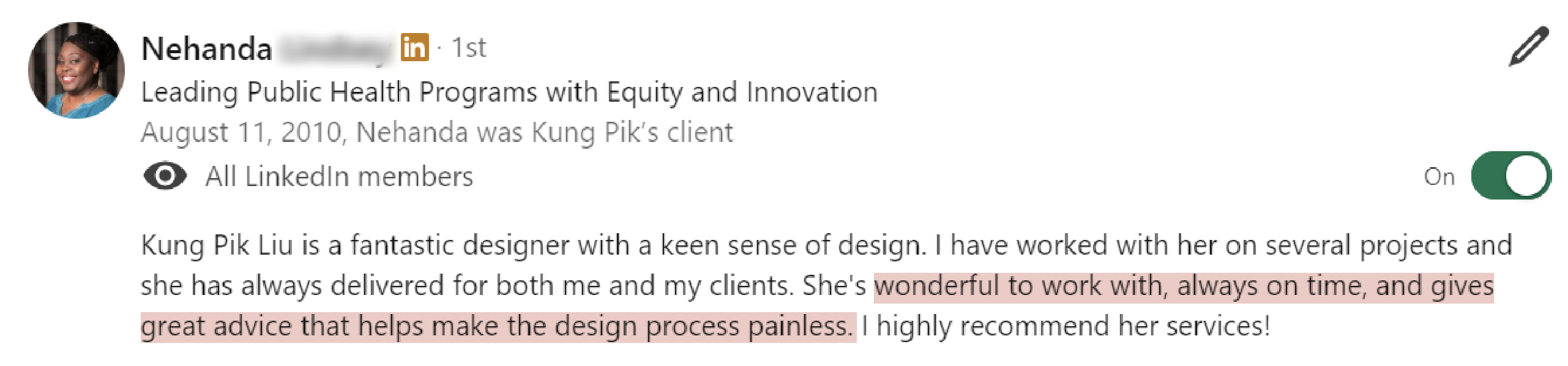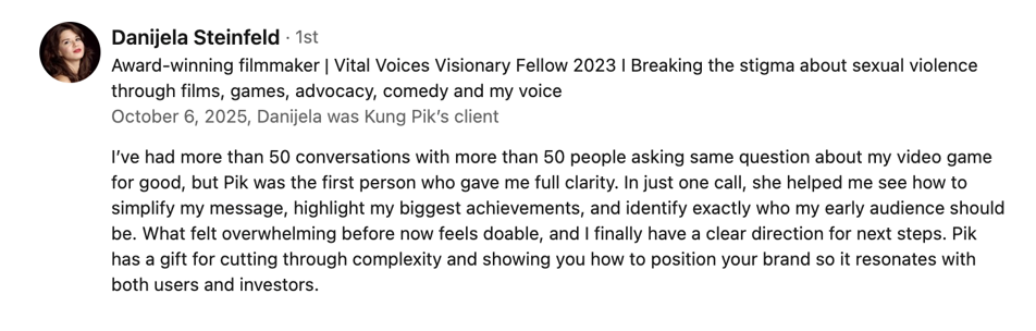 The process was intentional and deeply personal, helping me shift from quietly doing the work to here you can edit reviewss confidently owning my role as a thought leader. I’m now able to promote my personal brand with ease, stay aligned with my values, and make decisions that move me toward the opportunities I want most.